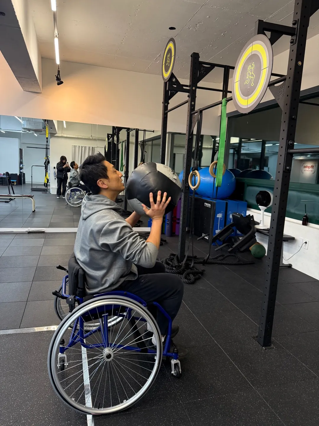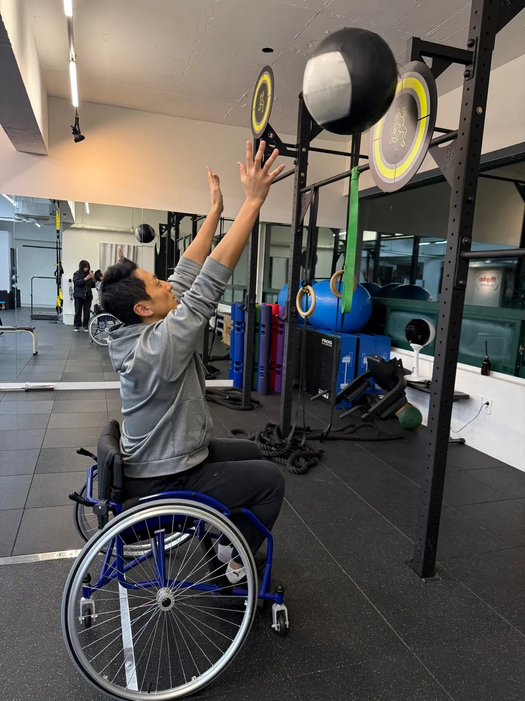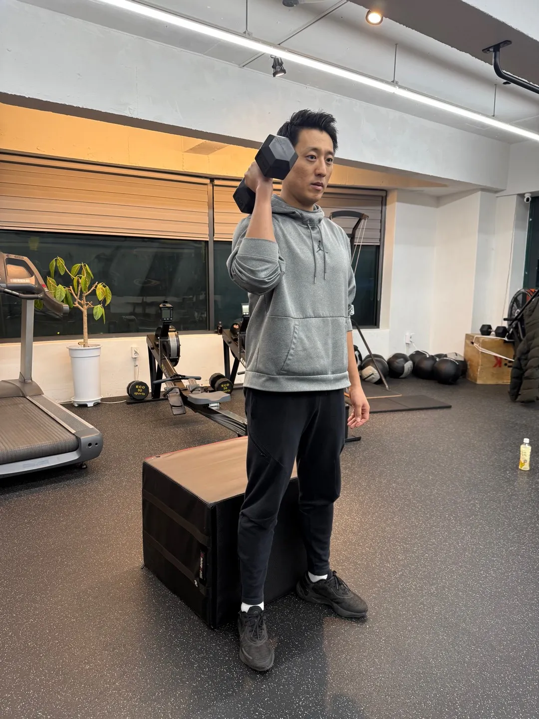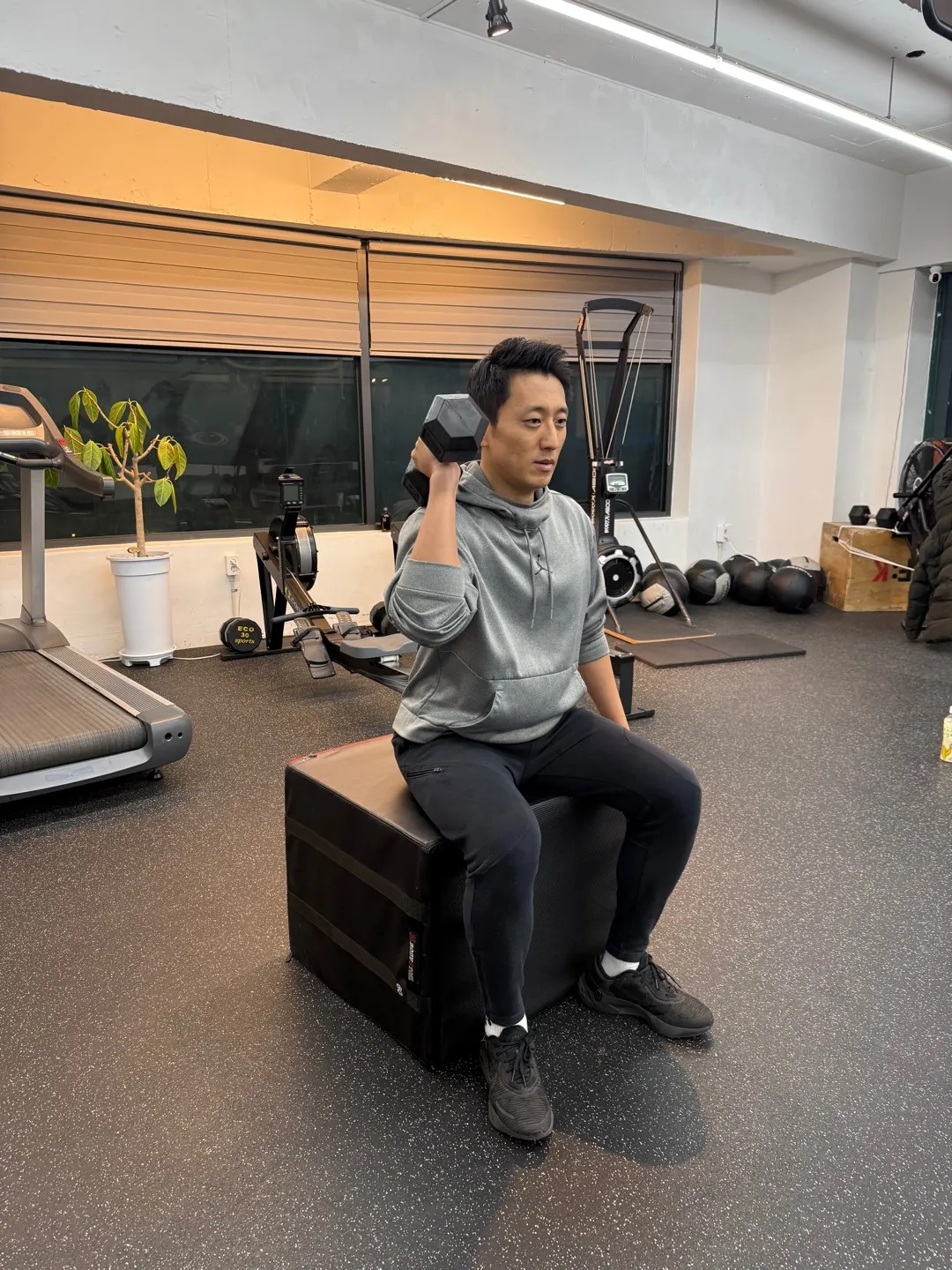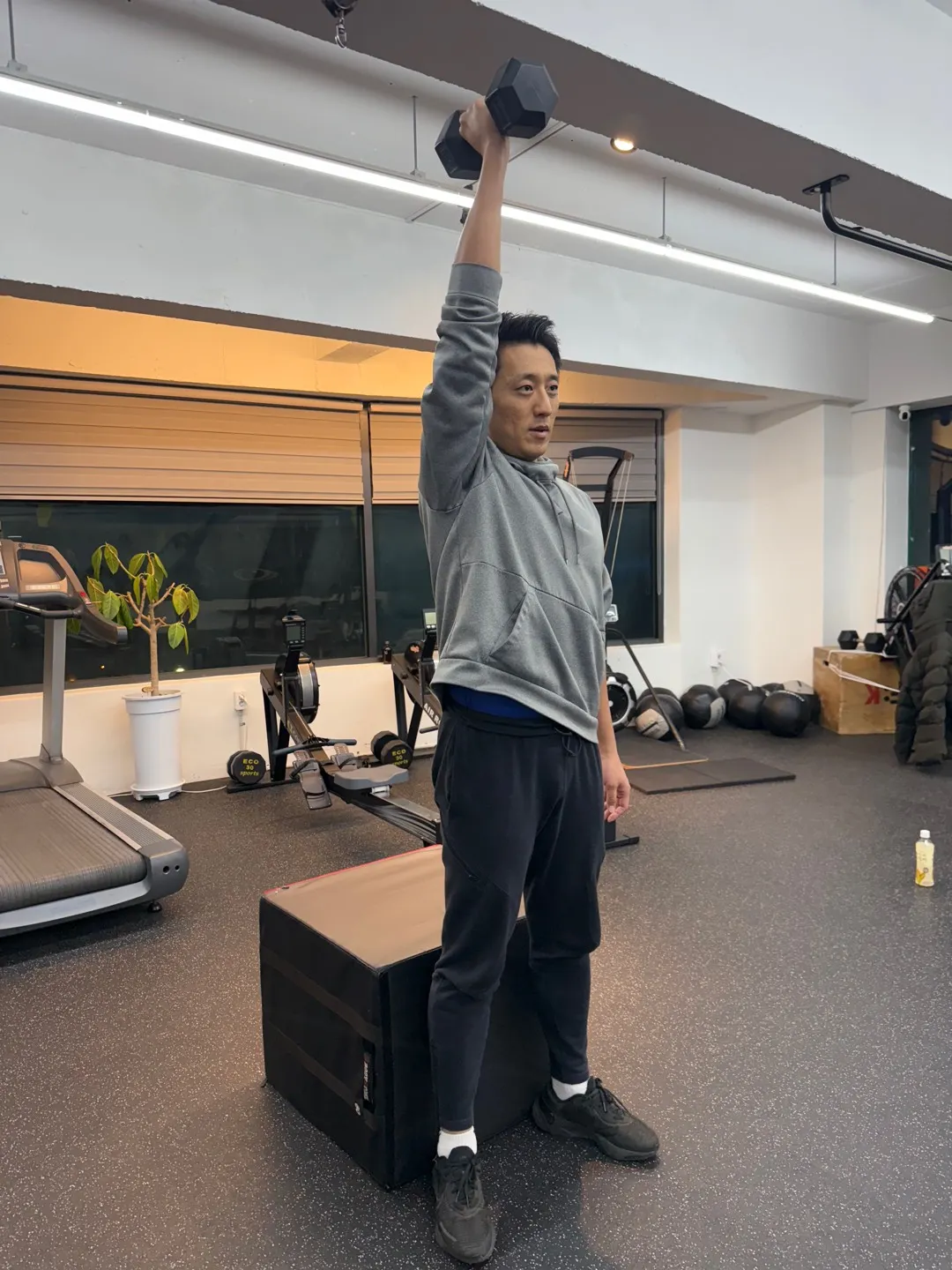 스쿼트(박스에 앉기)-머리위로 덤벨 들어올리기-내리기 순으로 수행한다.