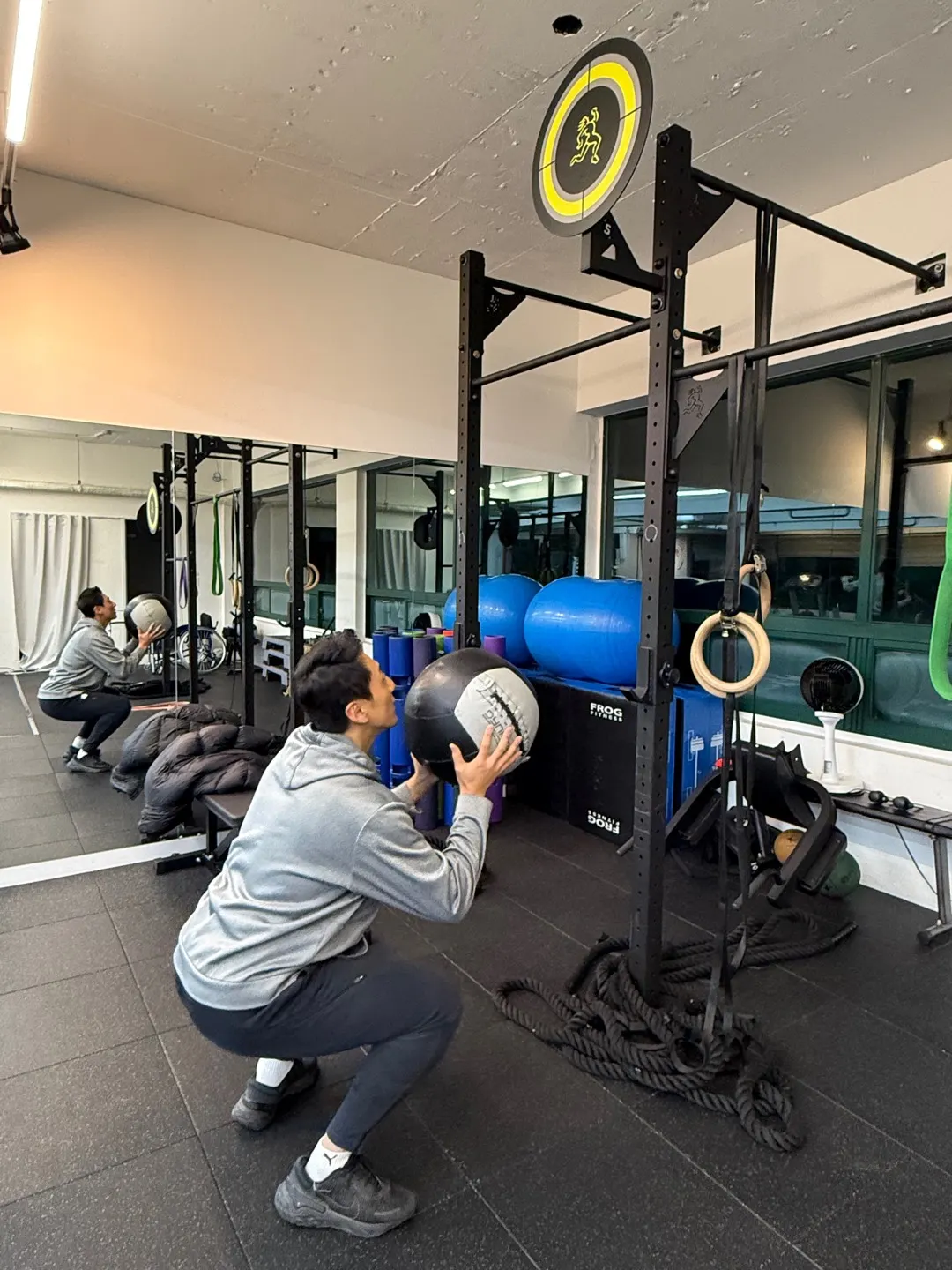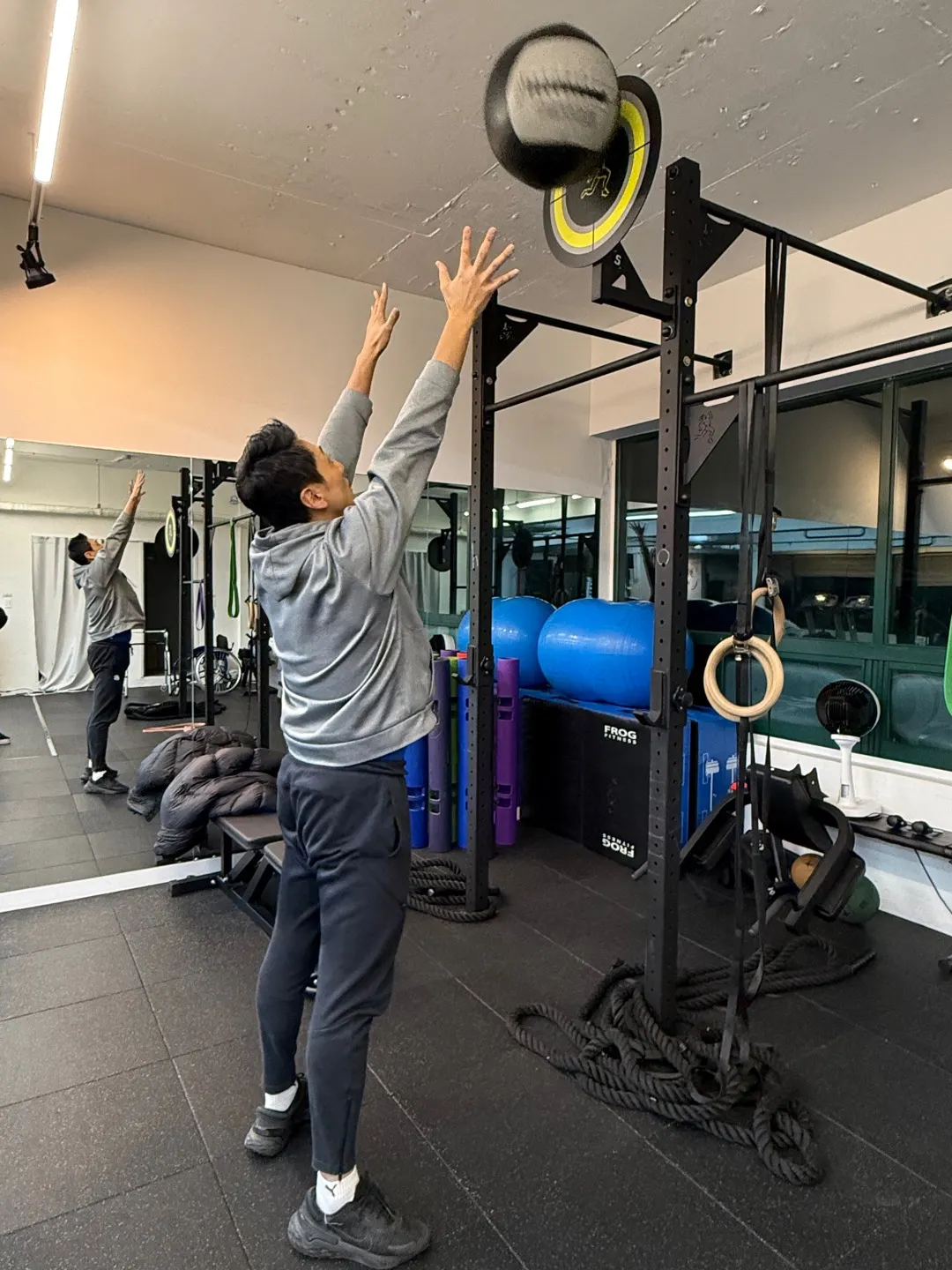 쓰러스터 동작 처럼 스쿼트-던지기-받기 순으로 수행한다.