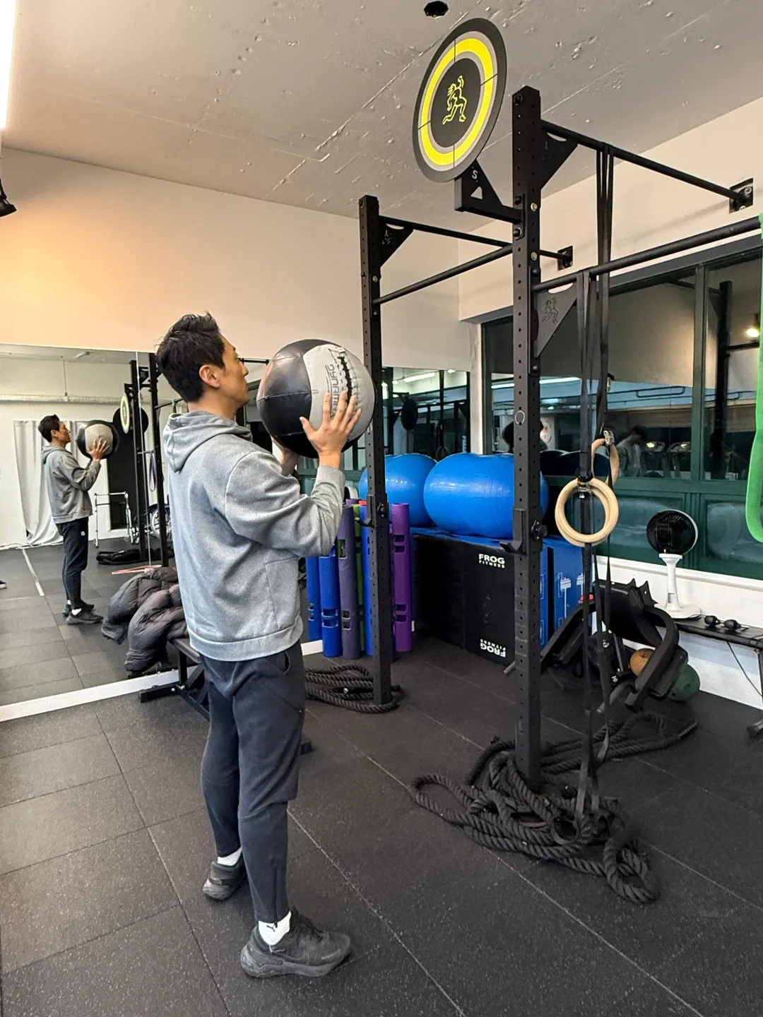 준비자세: 월볼을 가슴 앞에 든 채로 대기