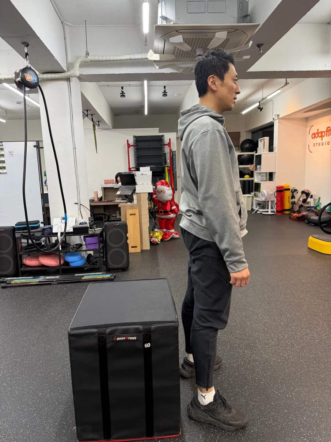 박스 위에 올라섰을 때 무릎, 고관절, 허리 등 모든 관절이 다 펴지도록 지도