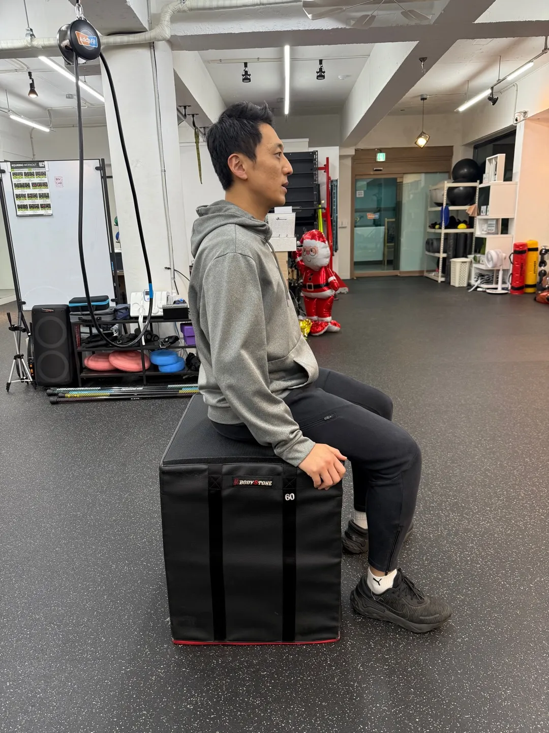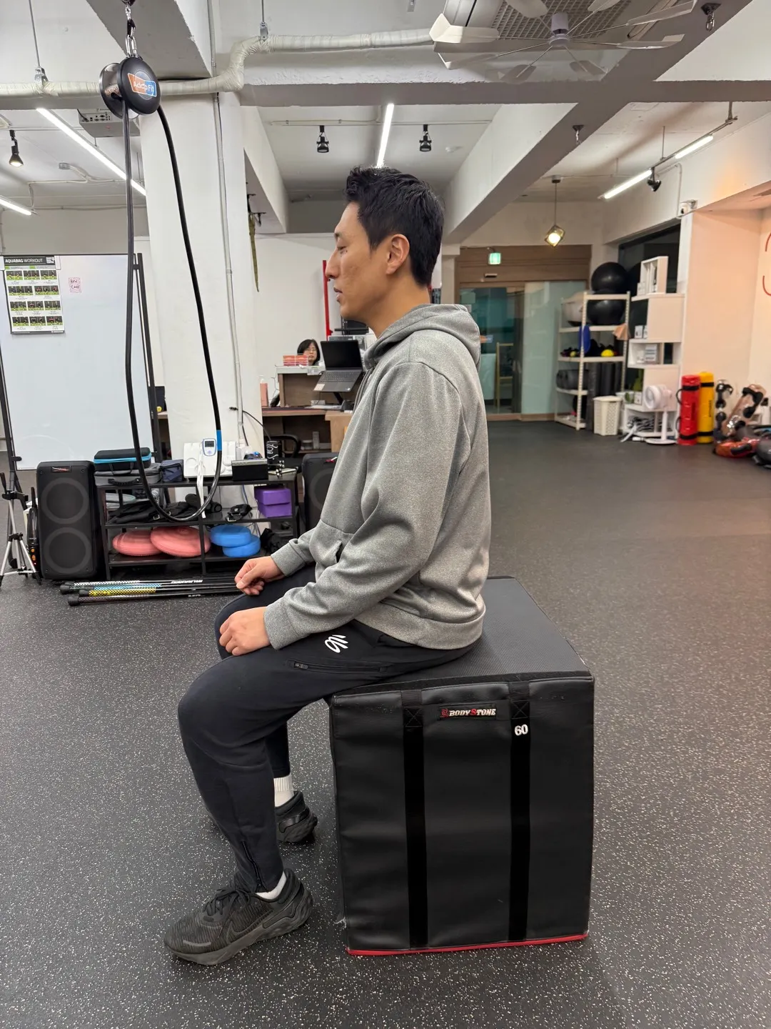 박스를 등지고 엉덩이를 박스에 대고 앉아 반대방향으로 터닝한 뒤 제자리에 일어서는 동작
